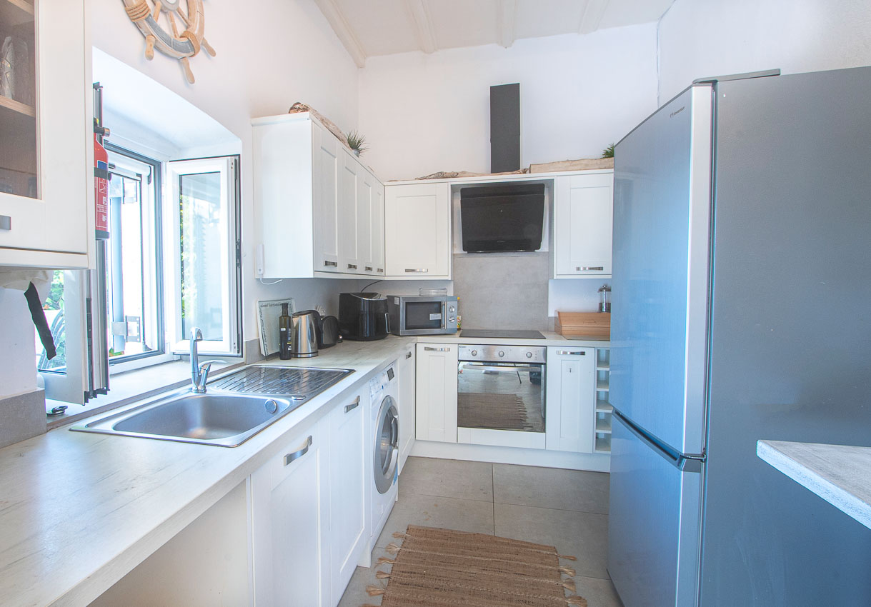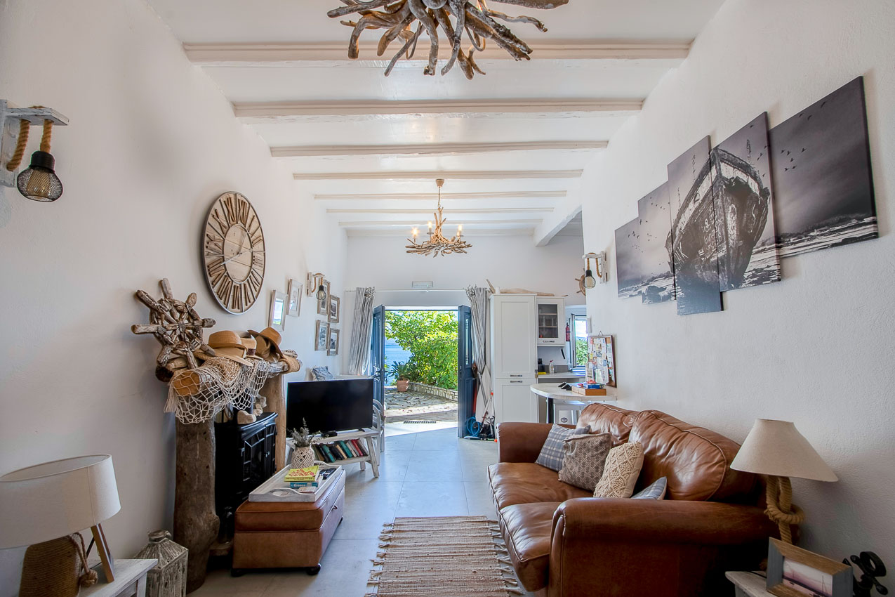 The ground-floor apartment has its own entrance, opening into a bright L-shaped kitchen and living area, with two bedrooms and two bathrooms. The paved stone terrace, framed by a low stone wall, provides an exceptional seafront setting for dining and relaxation, just steps from the sea.