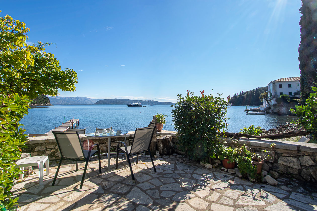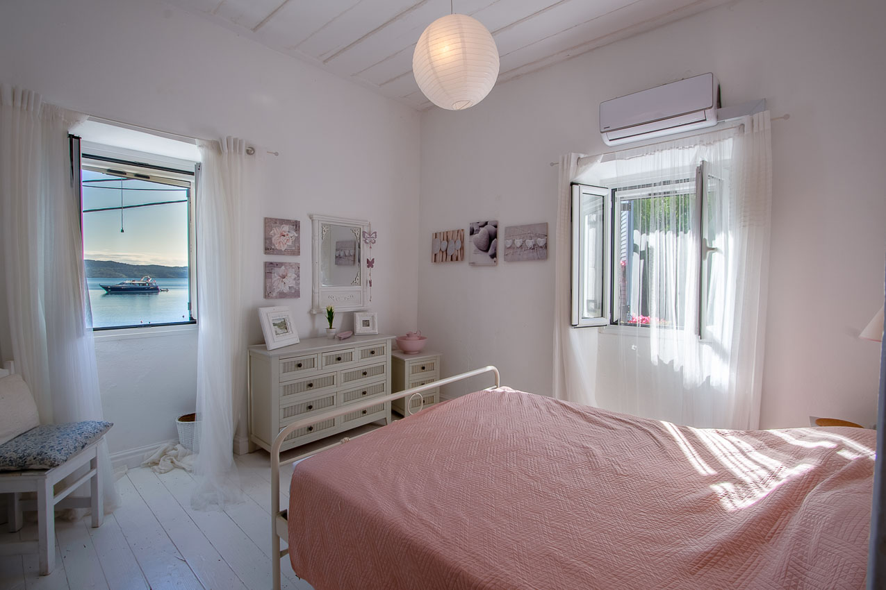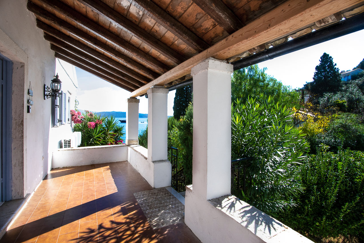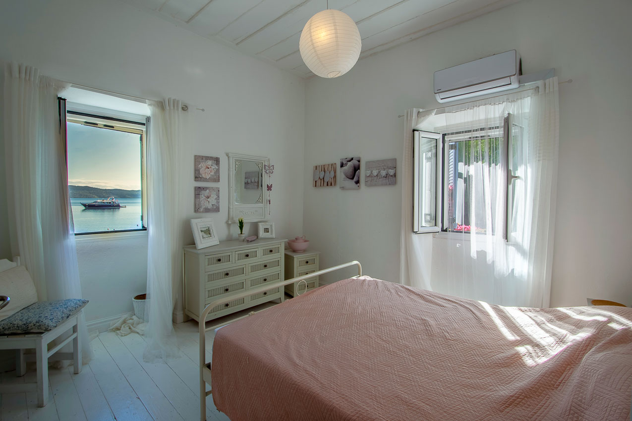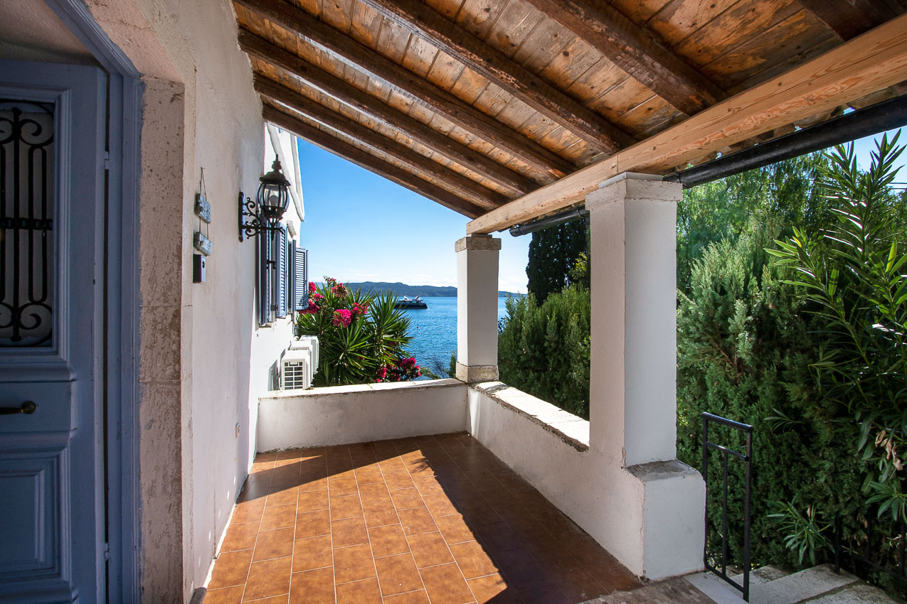 The upper-level apartment, accessed via a traditional exterior staircase and covered portico, features two bedrooms, a bathroom, and an open-plan kitchen/dining area. The spacious portico offers a peaceful setting for outdoor living, overlooking the coastline. Inside, original wooden floors and exposed beams preserve the home’s authentic Corfiot character.
