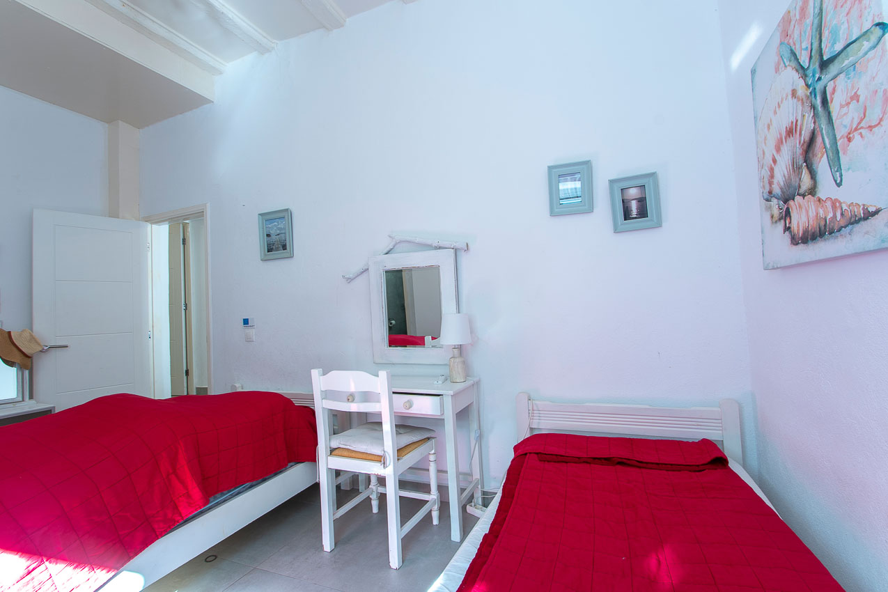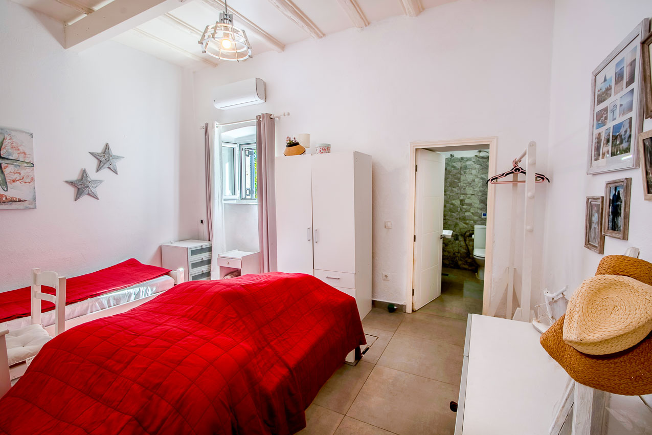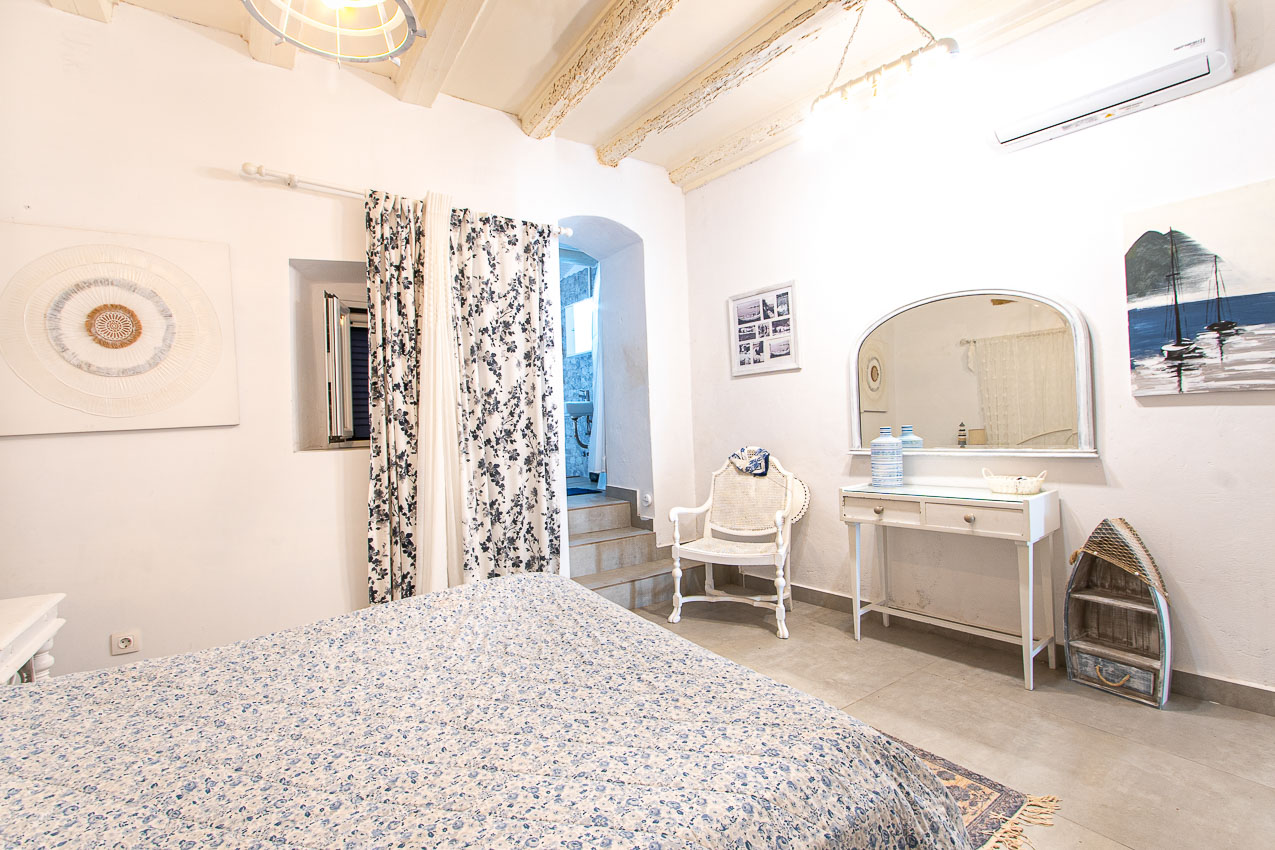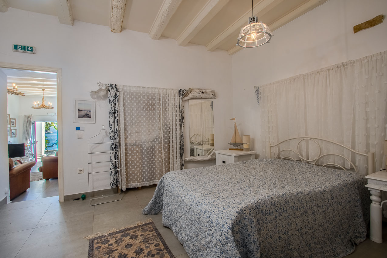 The upper-level apartment, accessed via a traditional exterior staircase and covered portico, features two bedrooms, a bathroom, and an open-plan kitchen/dining area. The spacious portico offers a peaceful setting for outdoor living, overlooking the coastline. Inside, original wooden floors and exposed beams preserve the home’s authentic Corfiot character.