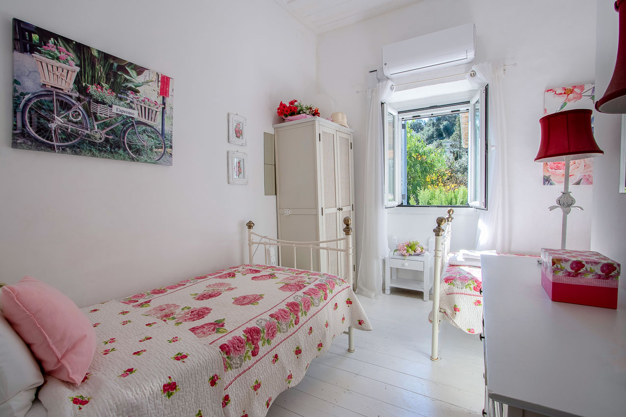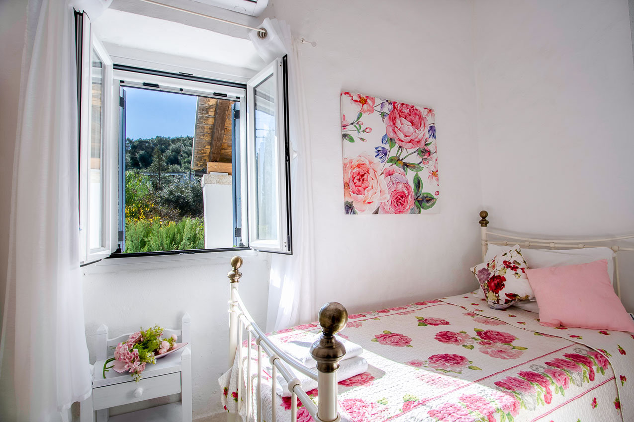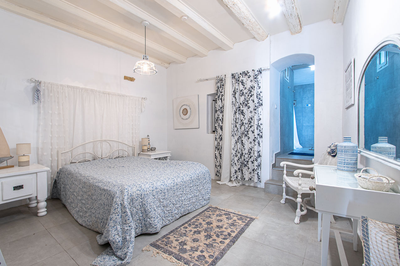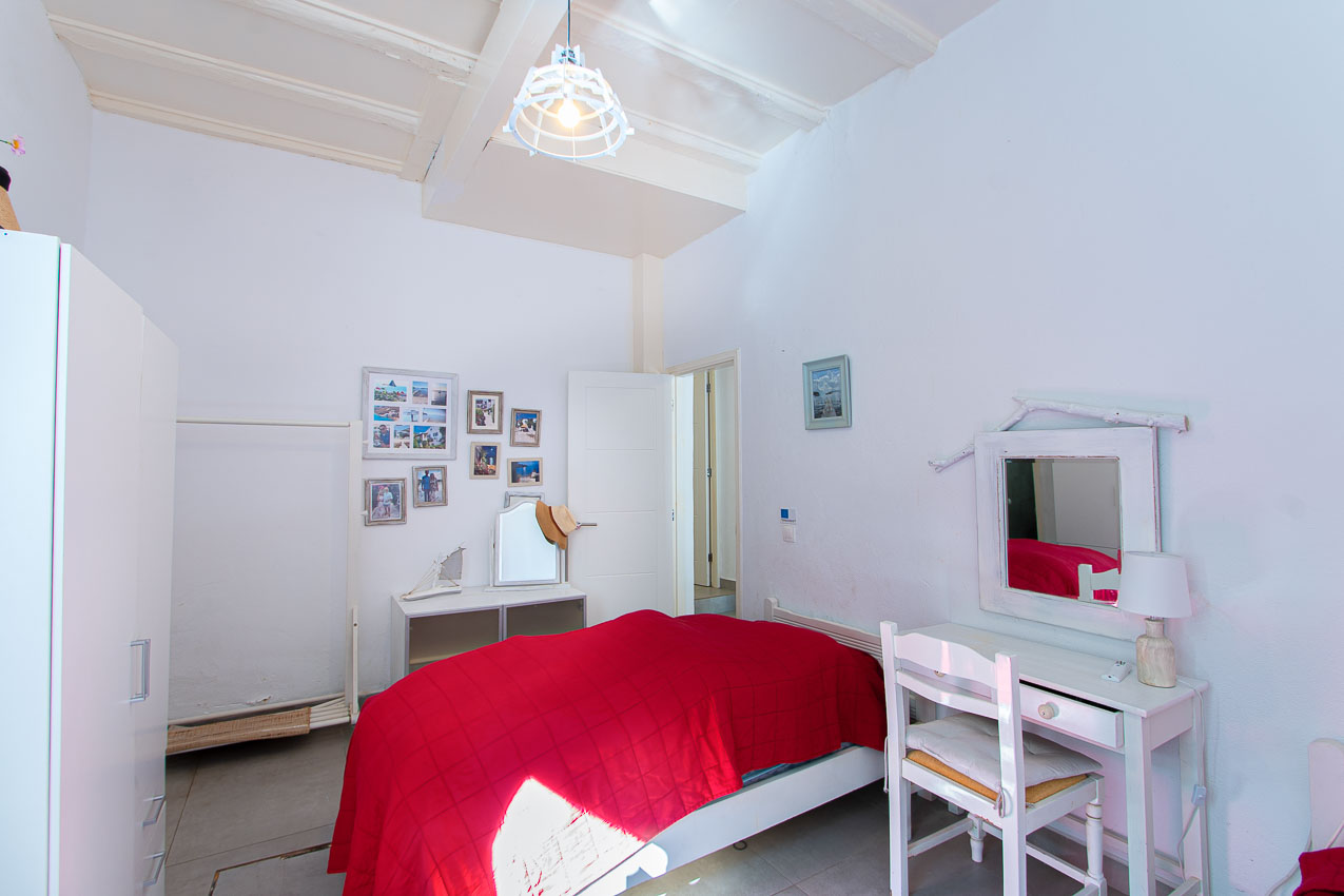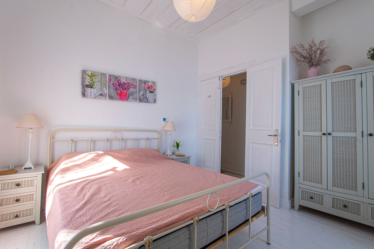 The upper-level apartment, accessed via a traditional exterior staircase and covered portico, features two bedrooms, a bathroom, and an open-plan kitchen/dining area. The spacious portico offers a peaceful setting for outdoor living, overlooking the coastline. Inside, original wooden floors and exposed beams preserve the home’s authentic Corfiot character.
