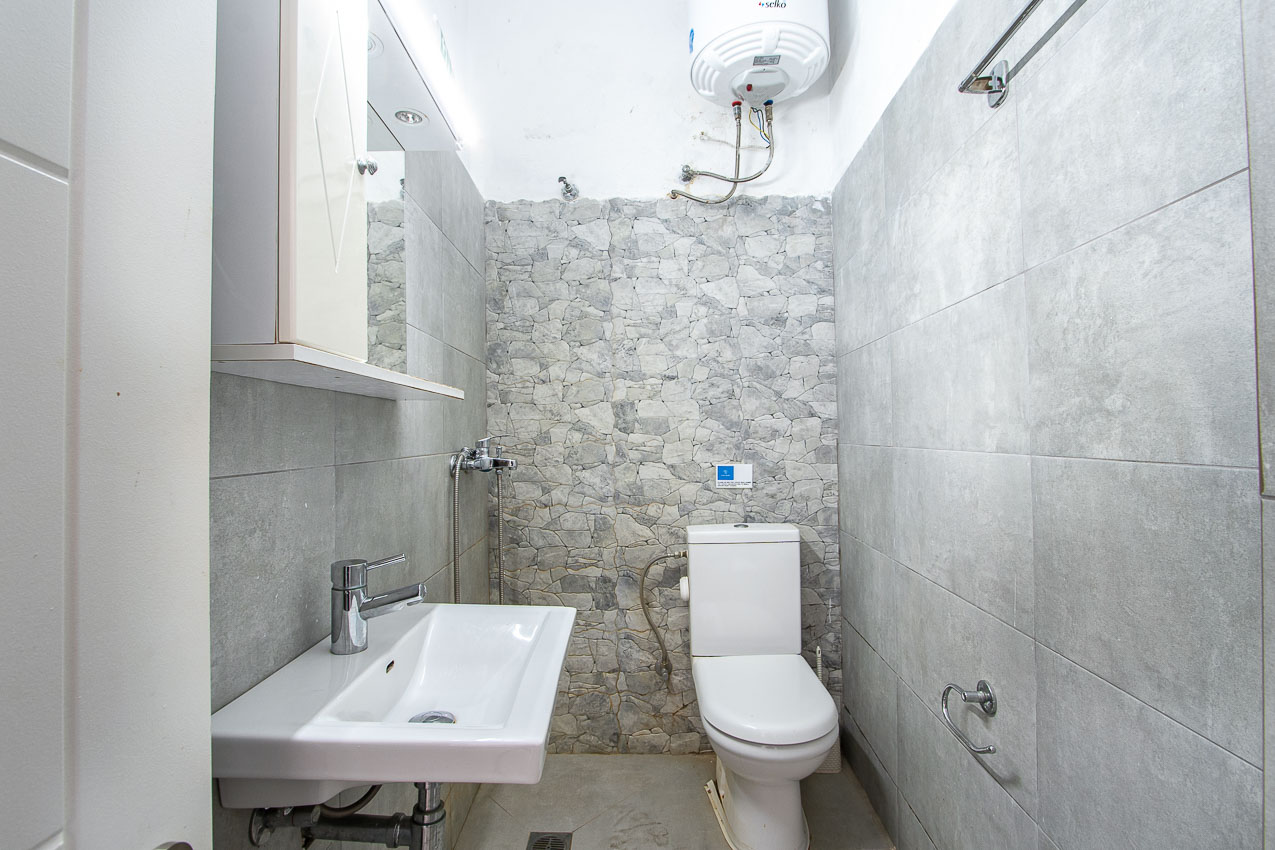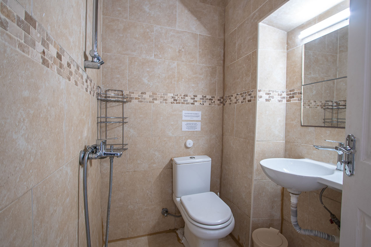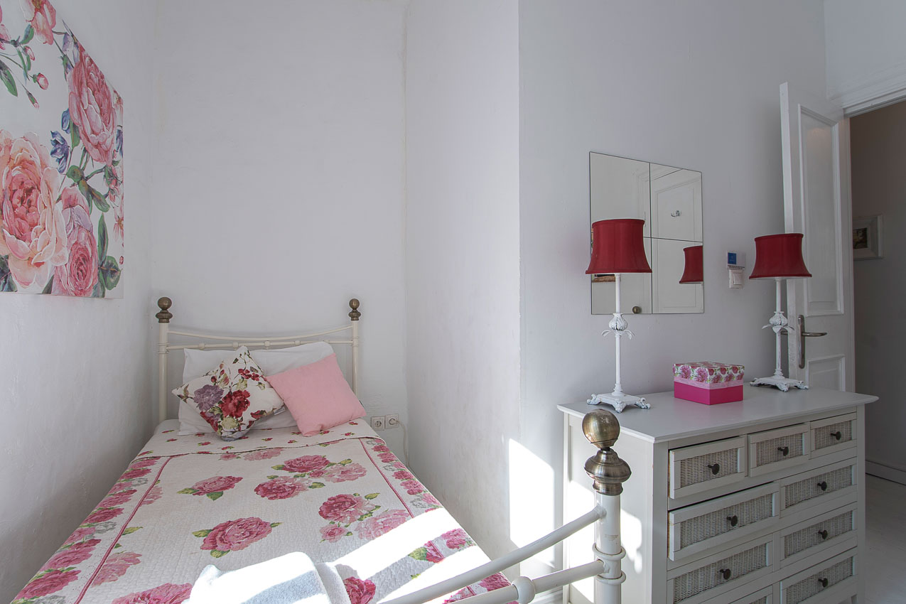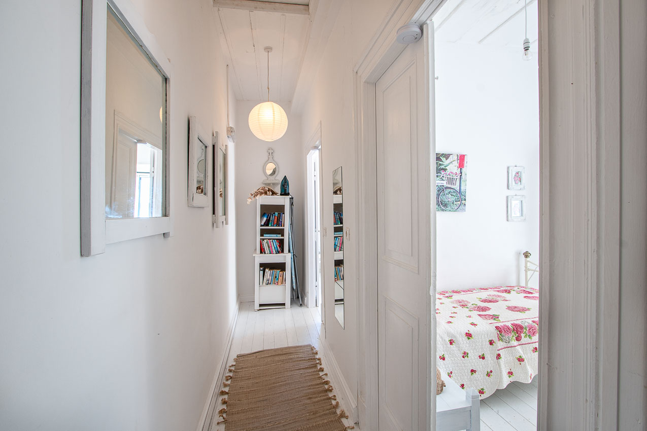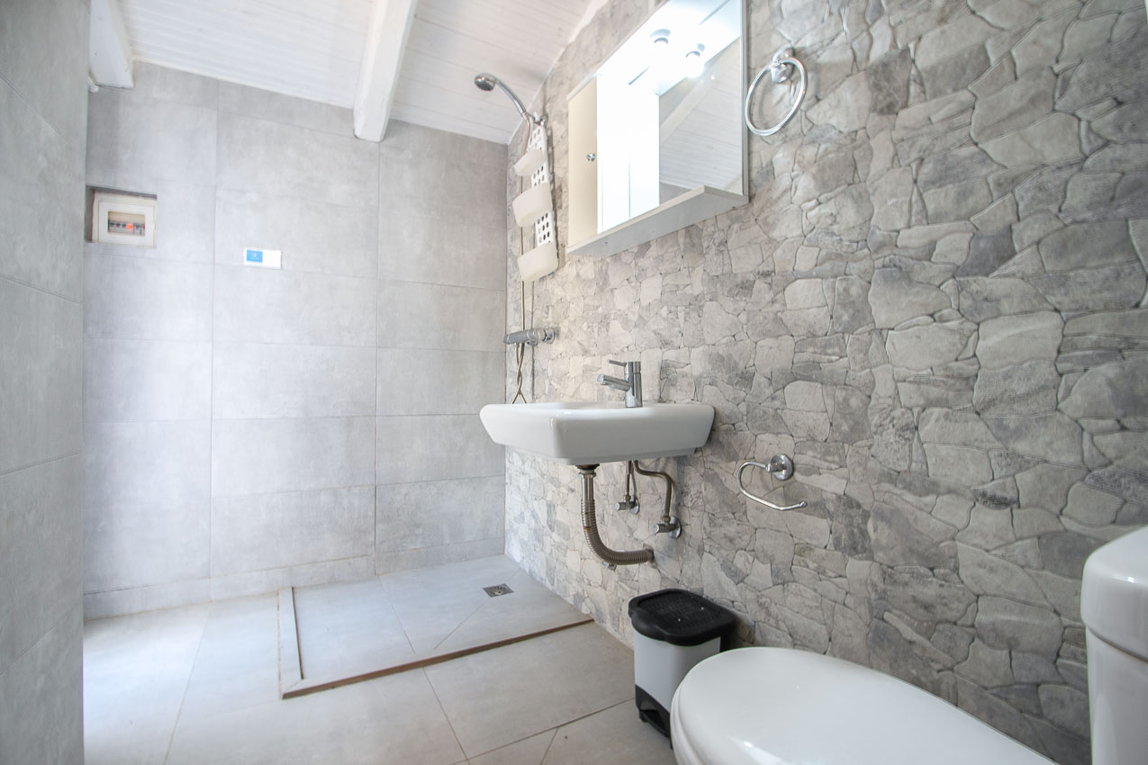 The upper-level apartment, accessed via a traditional exterior staircase and covered portico, features two bedrooms, a bathroom, and an open-plan kitchen/dining area. The spacious portico offers a peaceful setting for outdoor living, overlooking the coastline. Inside, original wooden floors and exposed beams preserve the home’s authentic Corfiot character.