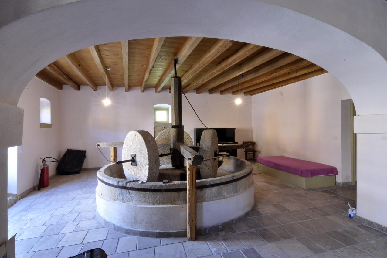 One dependency features, on the ground floor, a stone olive press that has remained intact, a room with fireplace, a kitchen, a bathroom and a WC. The first floor consists of a circa 80 sq. m. sunny room, formerly the region’s town hall and later a cultural centre.
