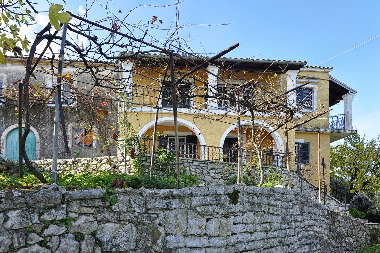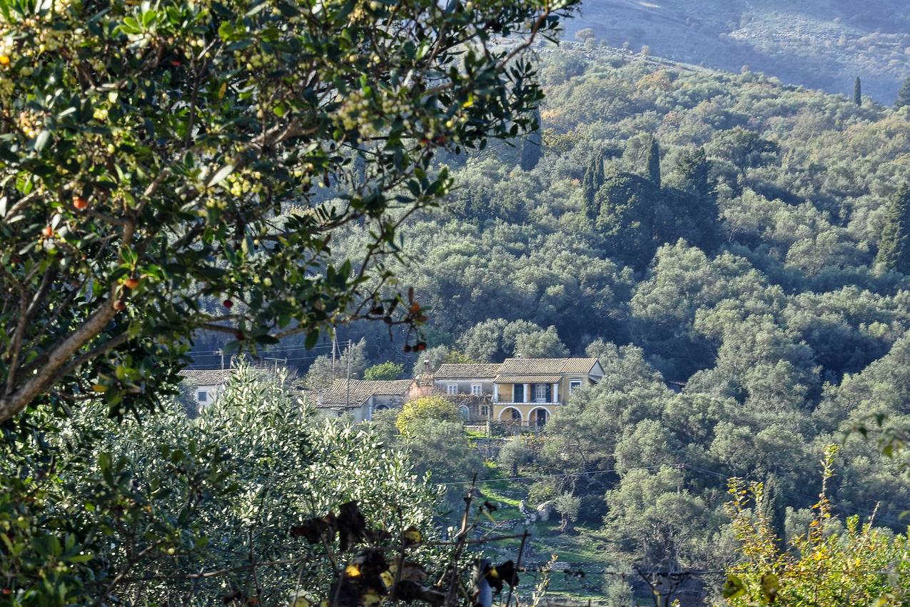 The main house features traditional character with arches on the ground level and carved stone pillars. The grounds of the property are planted with olive trees and other fruit trees.