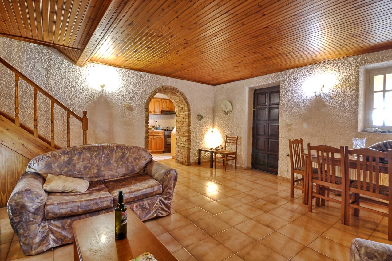 Steps from this level lead to the main house which had been renovated and requires small amount of works to be lived in. This house measures 119 square meters and spreads on 2 levels. The ground floor features spacious lounge/dinning area with fire place. An arched passage way leads to the kitchen of the property.