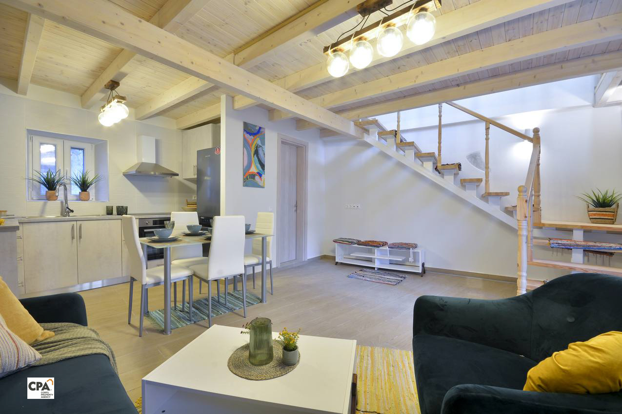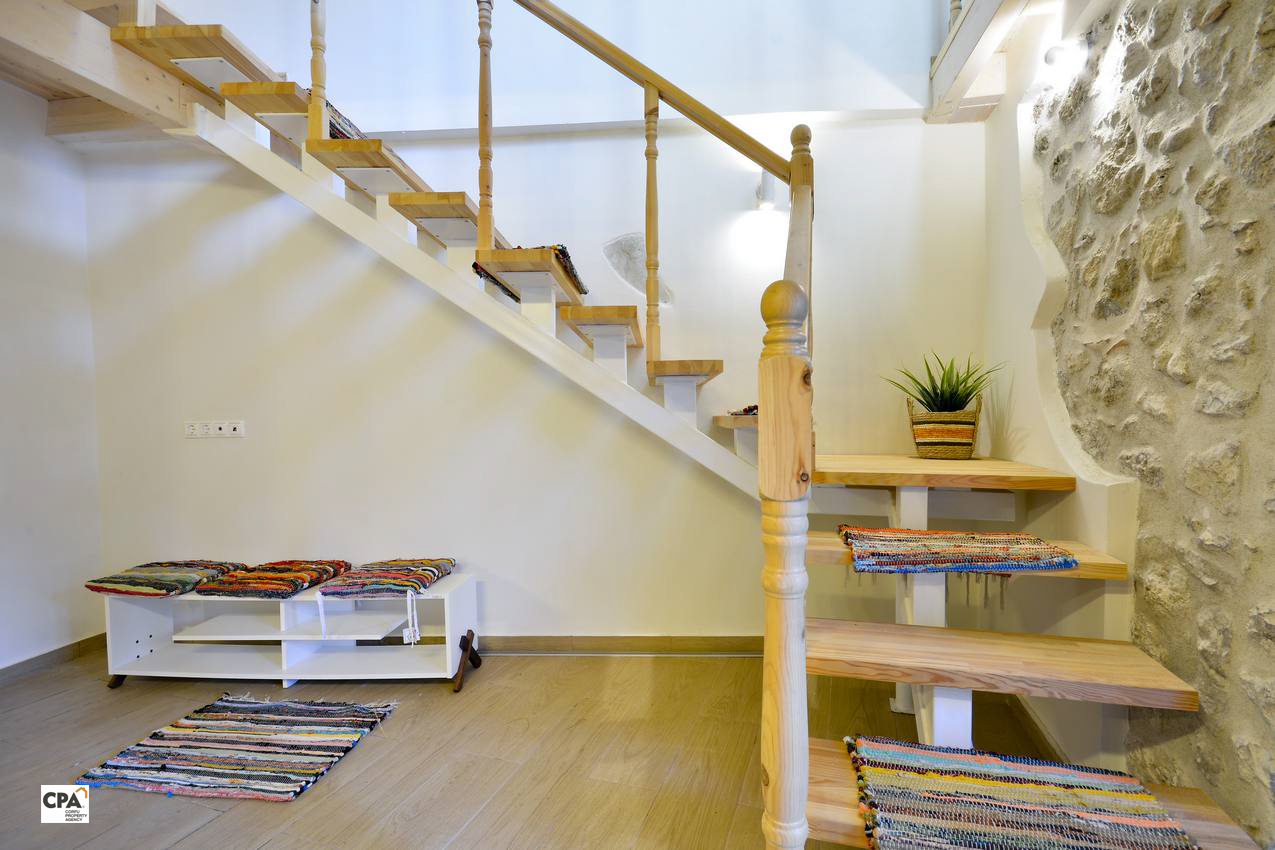The ground floor features fully fitted kitchen, open plan dinning/living area and a shower room. The exposed stone, in one of the walls of the living area and the wooden beams on the ceiling, provide a sense of cosines and warmth to the house. A minimal wooden staircase leads on to the top level of the house where there is a bedroom with a double bed and wardrobes and a second single bedroom. A bathroom with a shower completes this level.