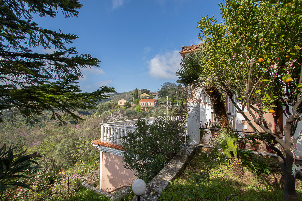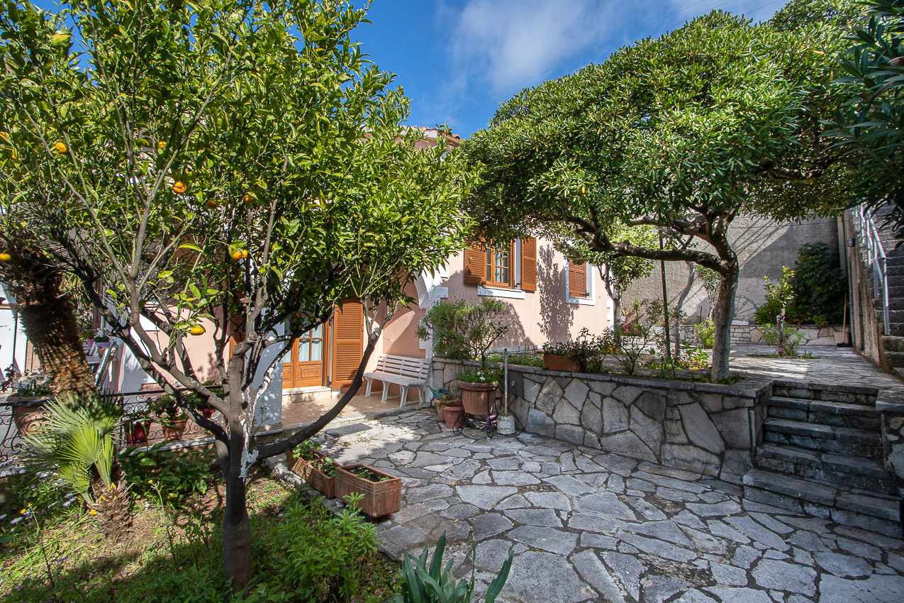 The landscaped garden surrounds the house with a combination of paved areas, flower beds, and mature planting. Steps lead to the upper part of the plot, where the panoramic views become even more impressive. The property also benefits from direct access to the village road and includes an enclosed garage with a secure door.