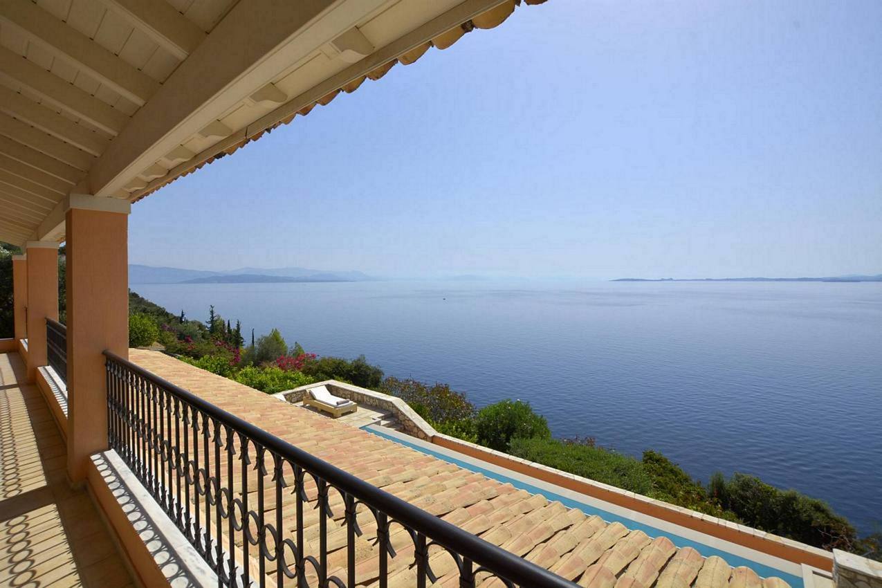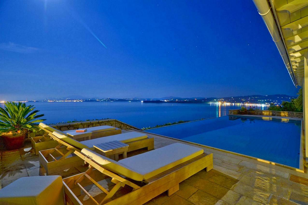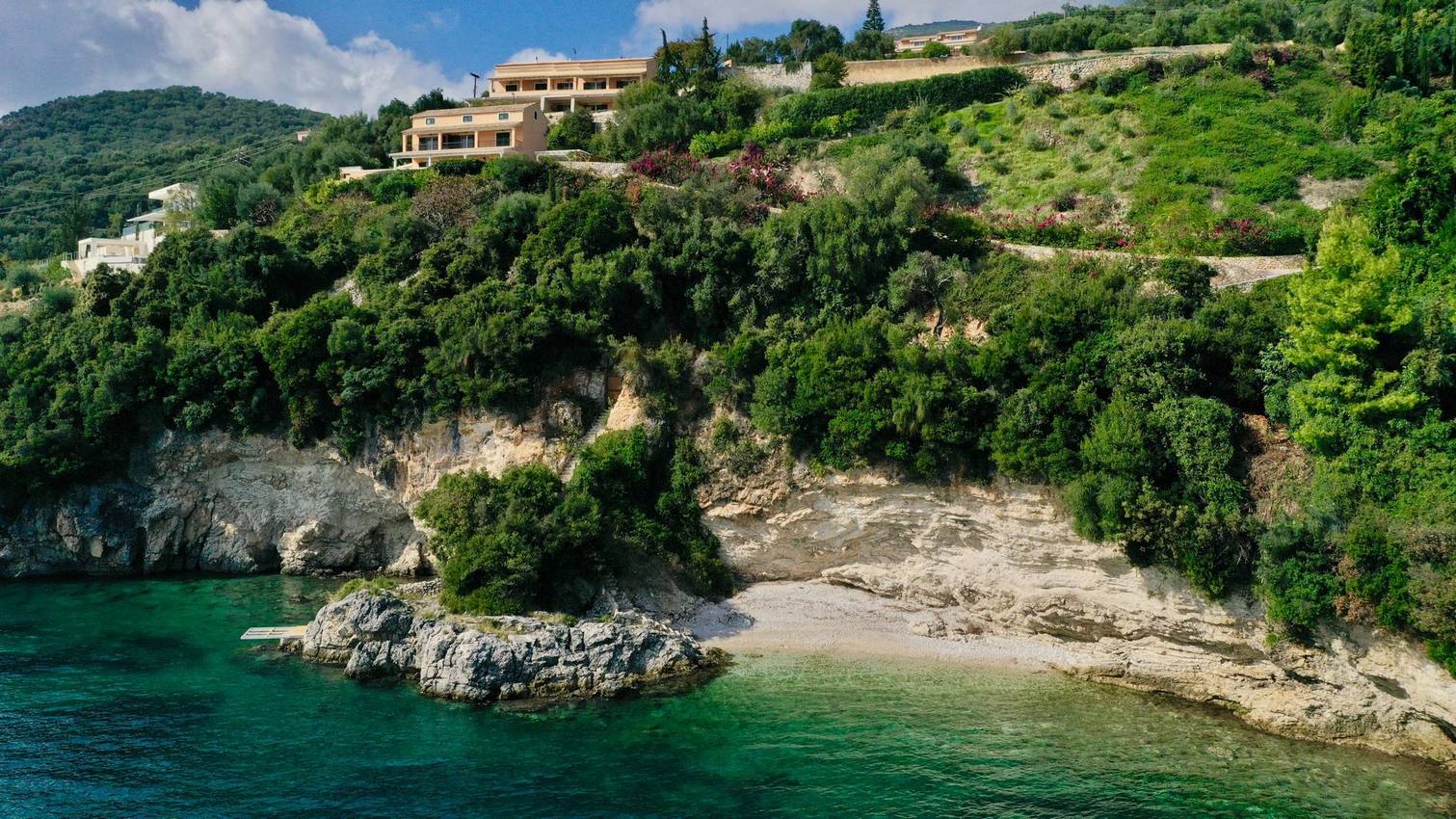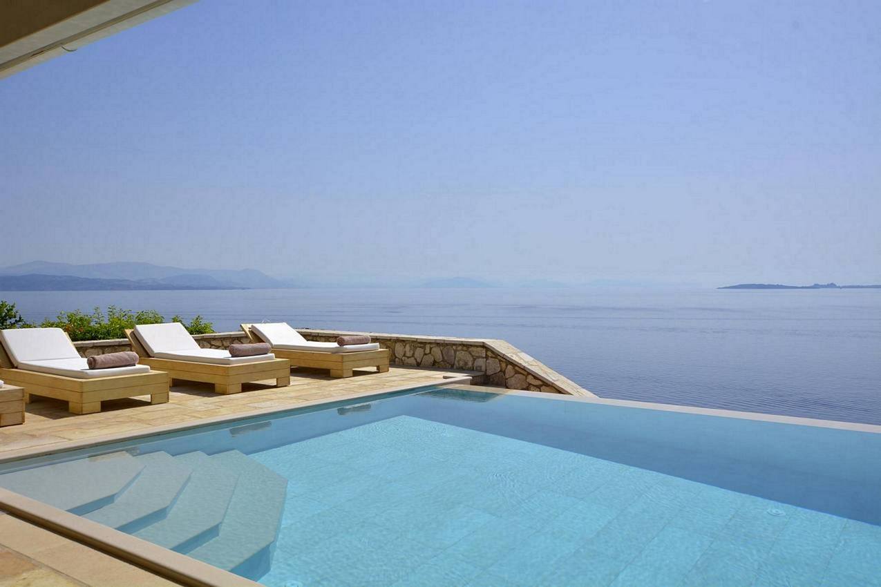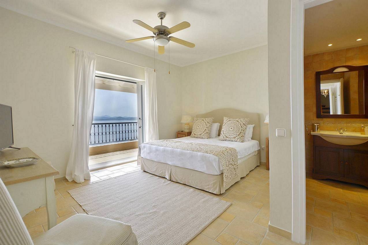 Stairs lead up to the first floor where there is a large master Bedroom with en suite bathroom featuring a bathtub with over tub shower and French Doors leading to the a private balcony. This floor also consists of a further double bedroom with en-suite bathroom and French doors leading to the balcony . A few more steps up to the second floor, where there is a large family/TV room and two bedrooms with en-suite bathrooms. The lower level of the property consists of a closed, secure parking space and a self catered guest studio. The infinity pool has been carefully positioned to enjoy the views to the maximum. There are three small and very private beaches close by that can be reached by foot. All local amenities are close by and the historical center of Corfu town is just a short drive away.