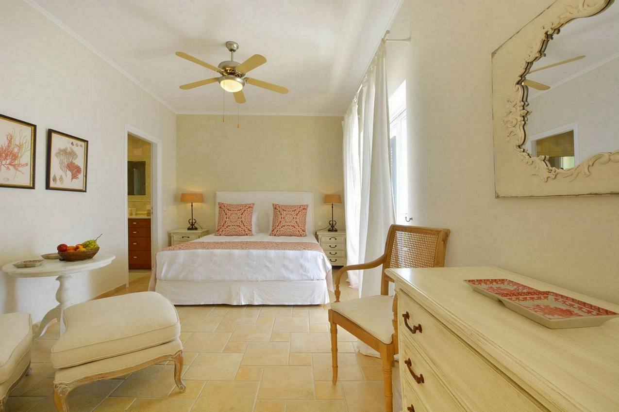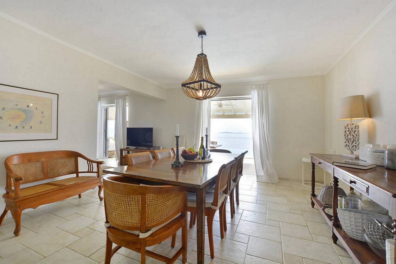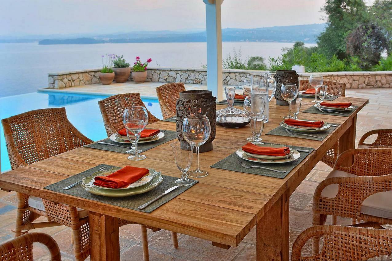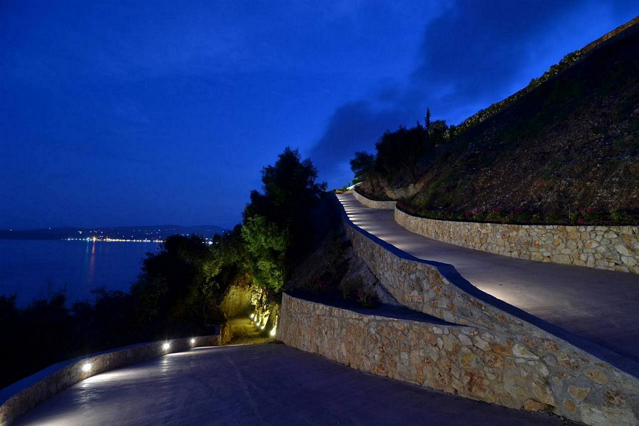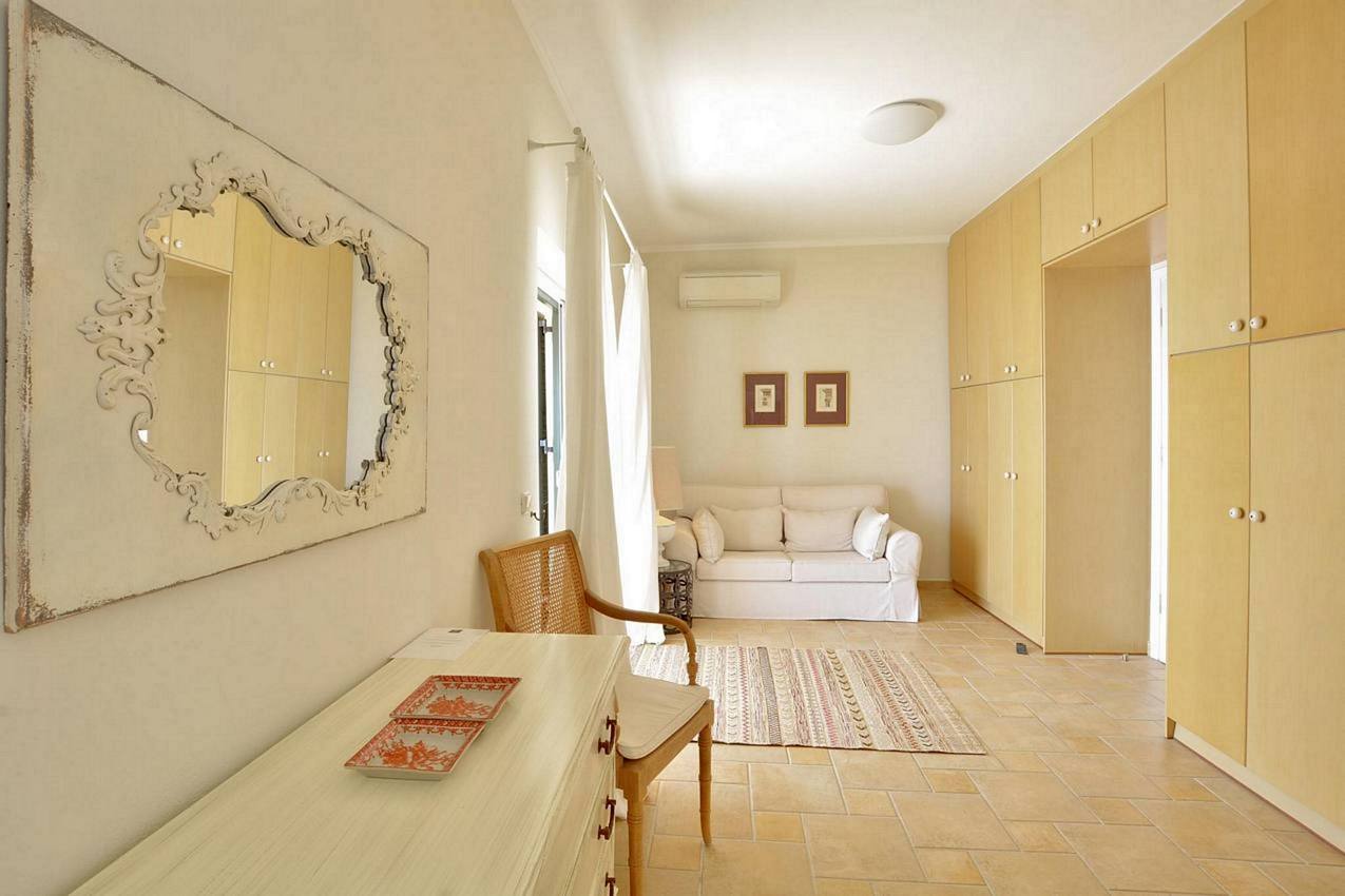 Stairs lead up to the first floor where there is a large master Bedroom with en suite bathroom featuring a bathtub with over tub shower and French Doors leading to the a private balcony. This floor also consists of a further double bedroom with en-suite bathroom and French doors leading to the balcony . A few more steps up to the second floor, where there is a large family/TV room and two bedrooms with en-suite bathrooms. The lower level of the property consists of a closed, secure parking space and a self catered guest studio. The infinity pool has been carefully positioned to enjoy the views to the maximum. There are three small and very private beaches close by that can be reached by foot. All local amenities are close by and the historical center of Corfu town is just a short drive away.