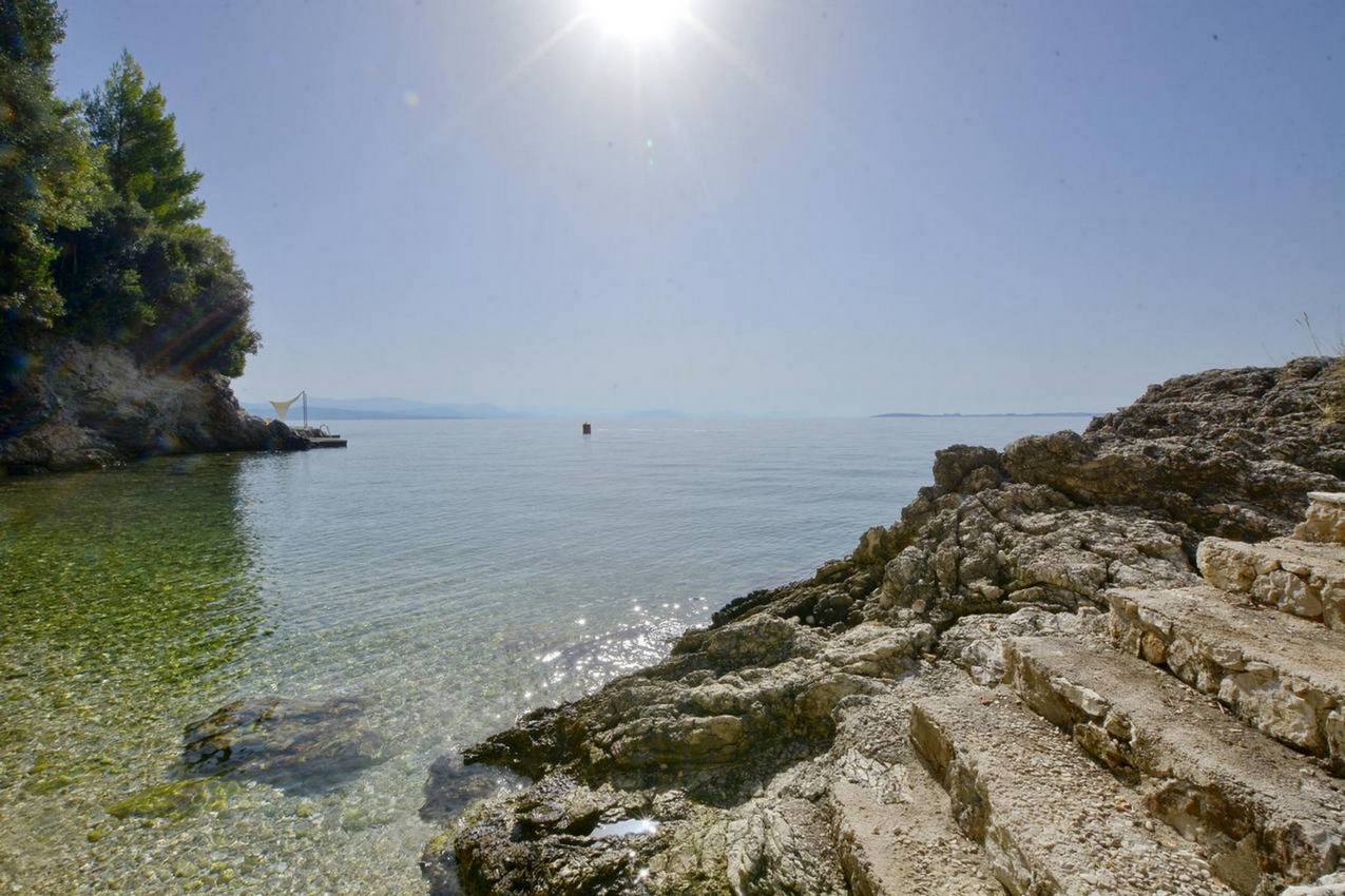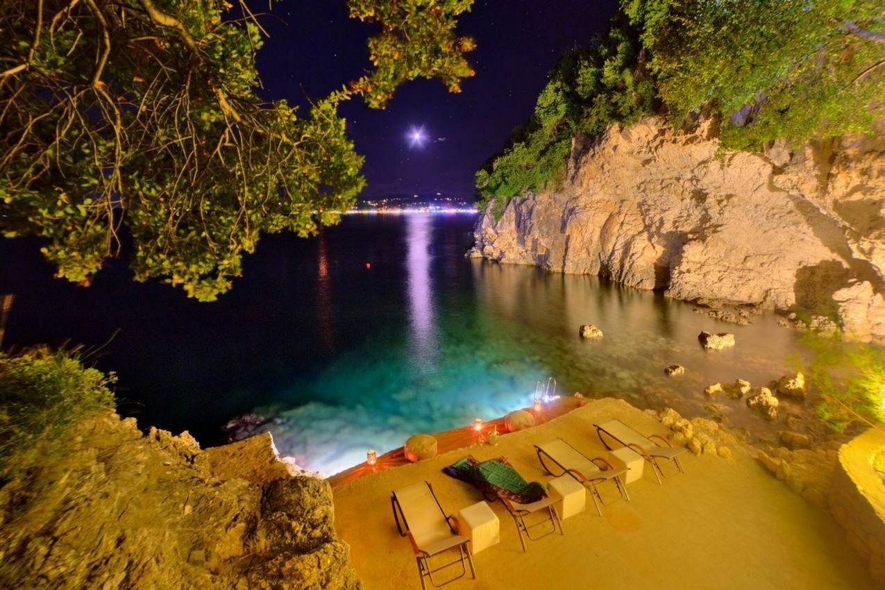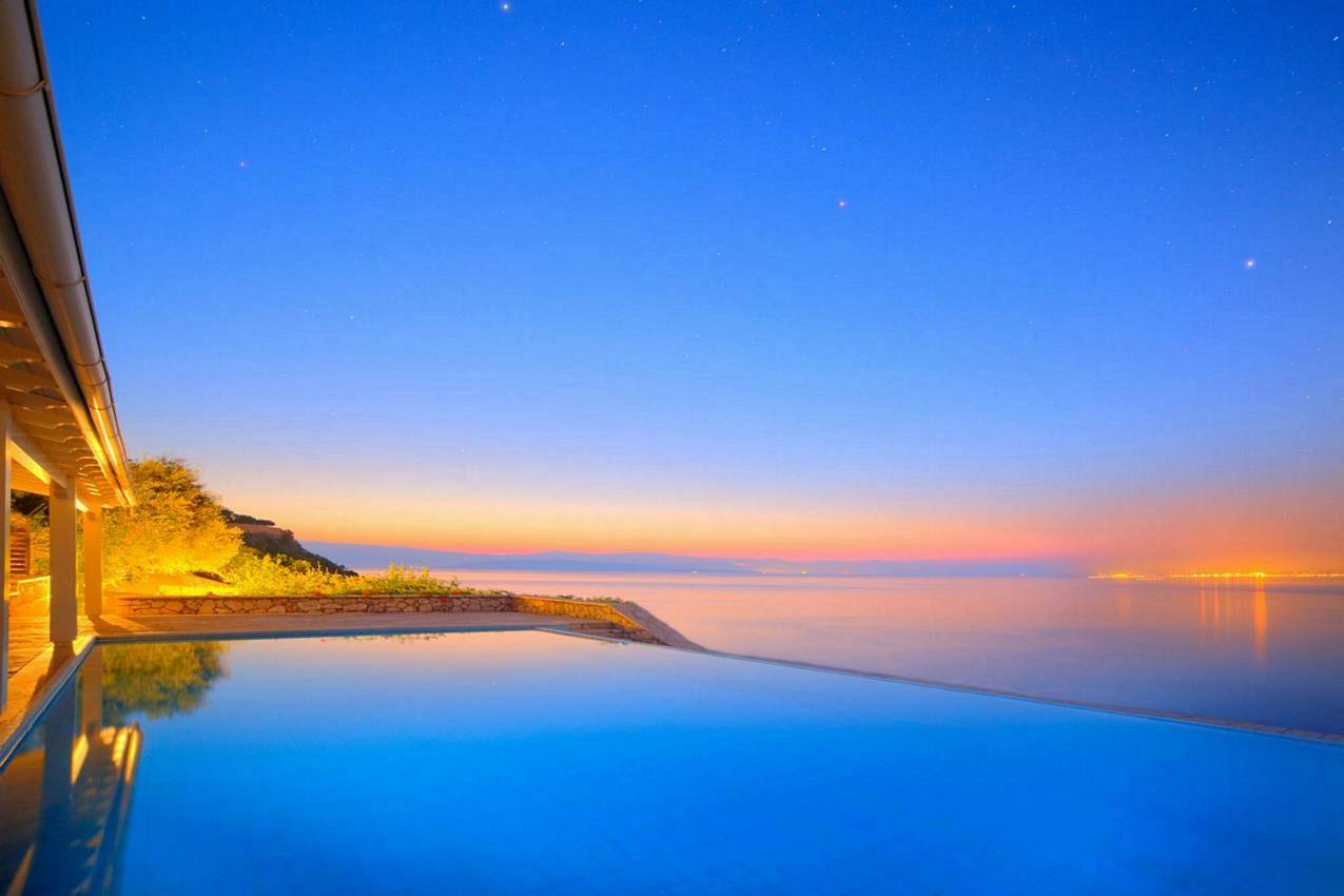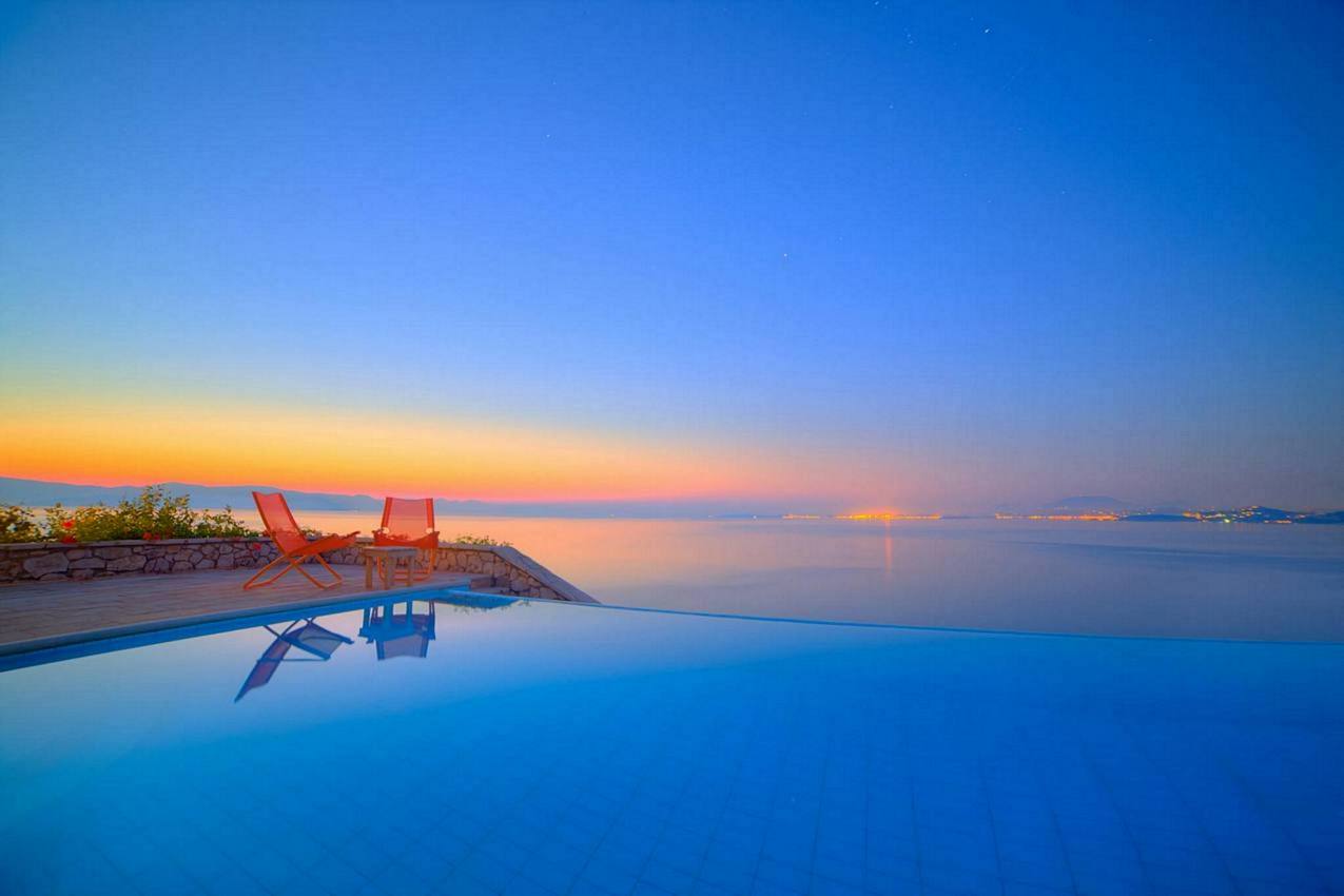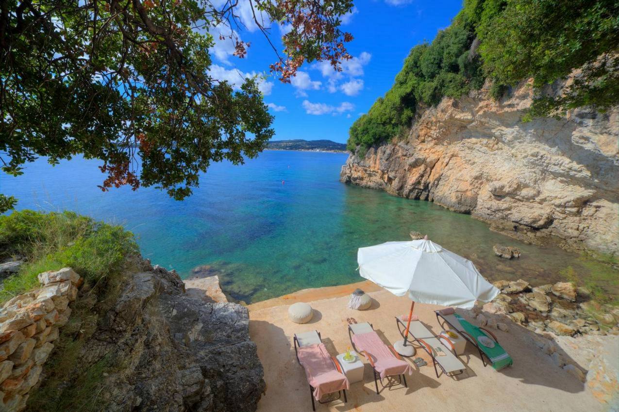 Stairs lead up to the first floor where there is a large master Bedroom with en suite bathroom featuring a bathtub with over tub shower and French Doors leading to the a private balcony. This floor also consists of a further double bedroom with en-suite bathroom and French doors leading to the balcony . A few more steps up to the second floor, where there is a large family/TV room and two bedrooms with en-suite bathrooms. The lower level of the property consists of a closed, secure parking space and a self catered guest studio. The infinity pool has been carefully positioned to enjoy the views to the maximum. There are three small and very private beaches close by that can be reached by foot. All local amenities are close by and the historical center of Corfu town is just a short drive away.